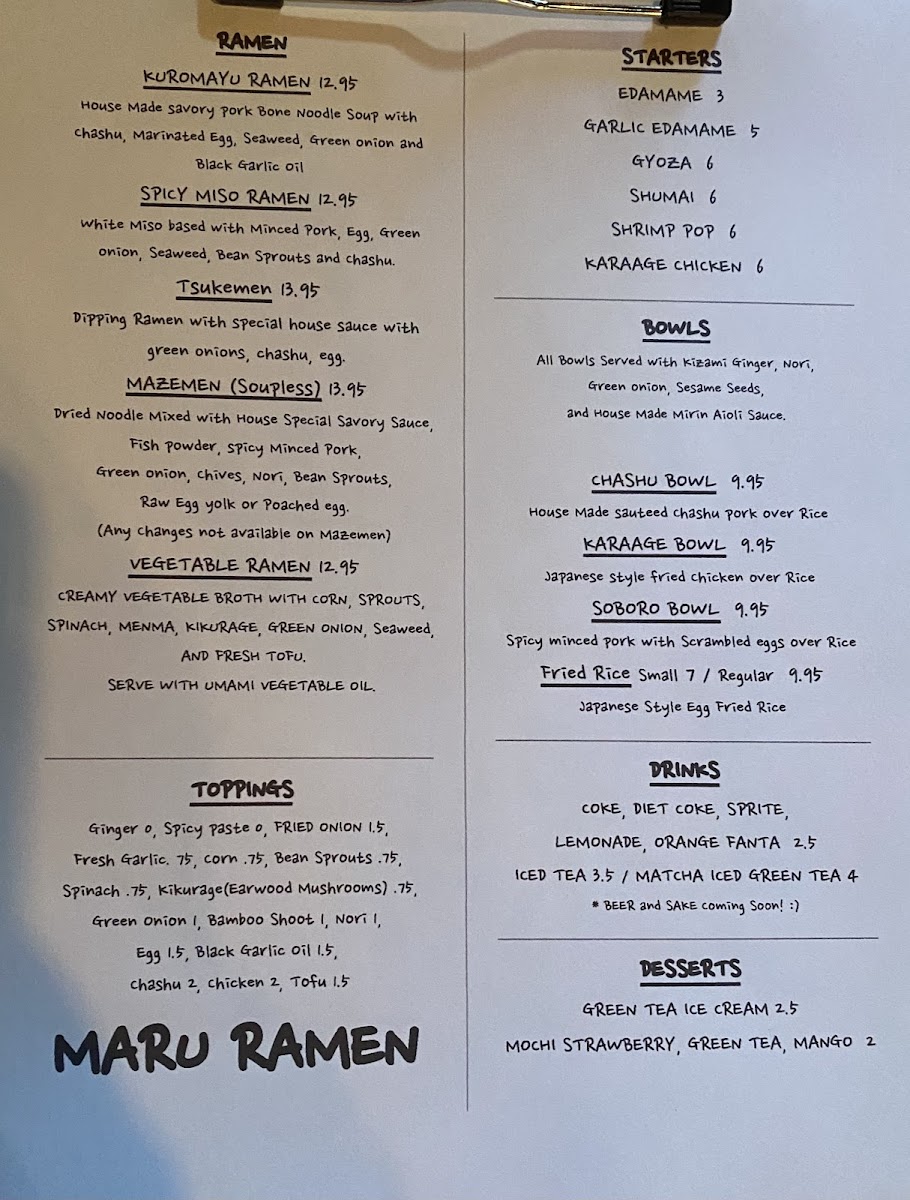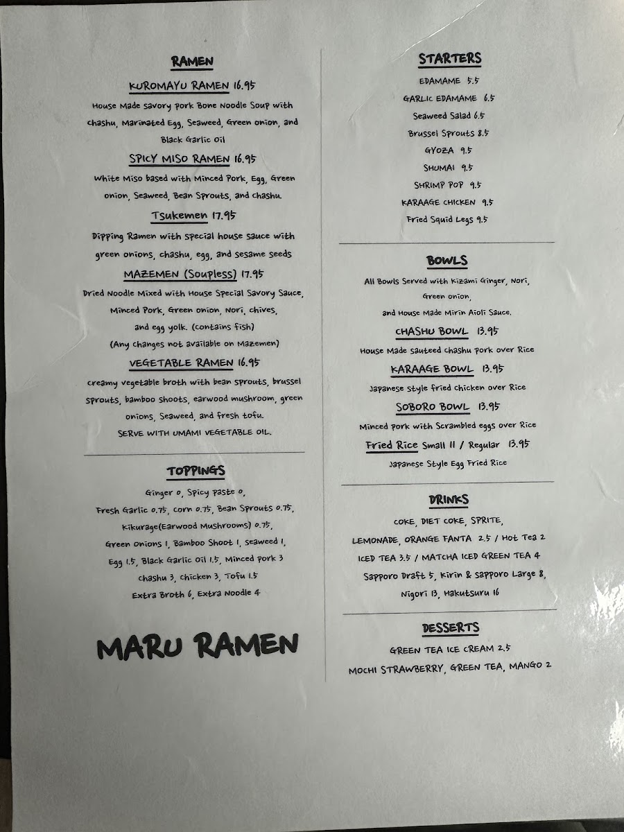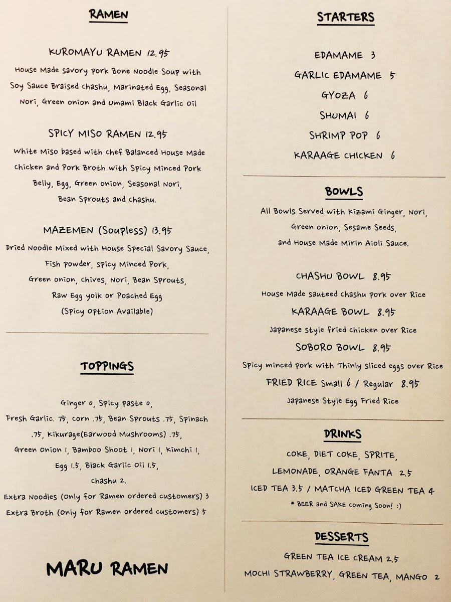 The menu at Maru Ramen offers a cozy and straightforward selection that focuses on comforting, hearty bowls and thoughtful small plates. Designed for casual dining, it’s the kind of place where you can enjoy a fulfilling meal any day you’re craving something warm and satisfying. Whether stopping by for lunch or a relaxed dinner, the variety here supports a laid-back atmosphere that encourages savoring each bite.